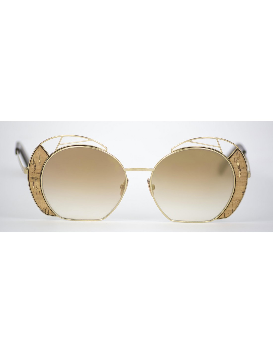 Montatura oversize dalla forma tonda con riporti in sughero e lenti specchiate oro.