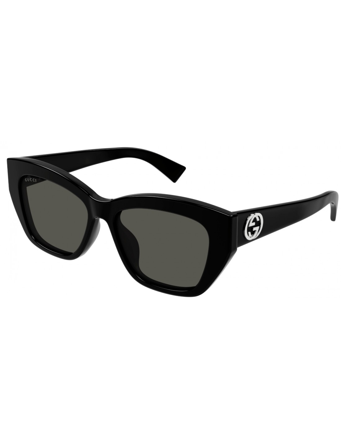 Montature oversize in acetato dai volumi spessi e geometrici. Frontale cat-eye squadrato oversize collegato a un’asta più sottile. Logo GG Interlocking sull’asta.